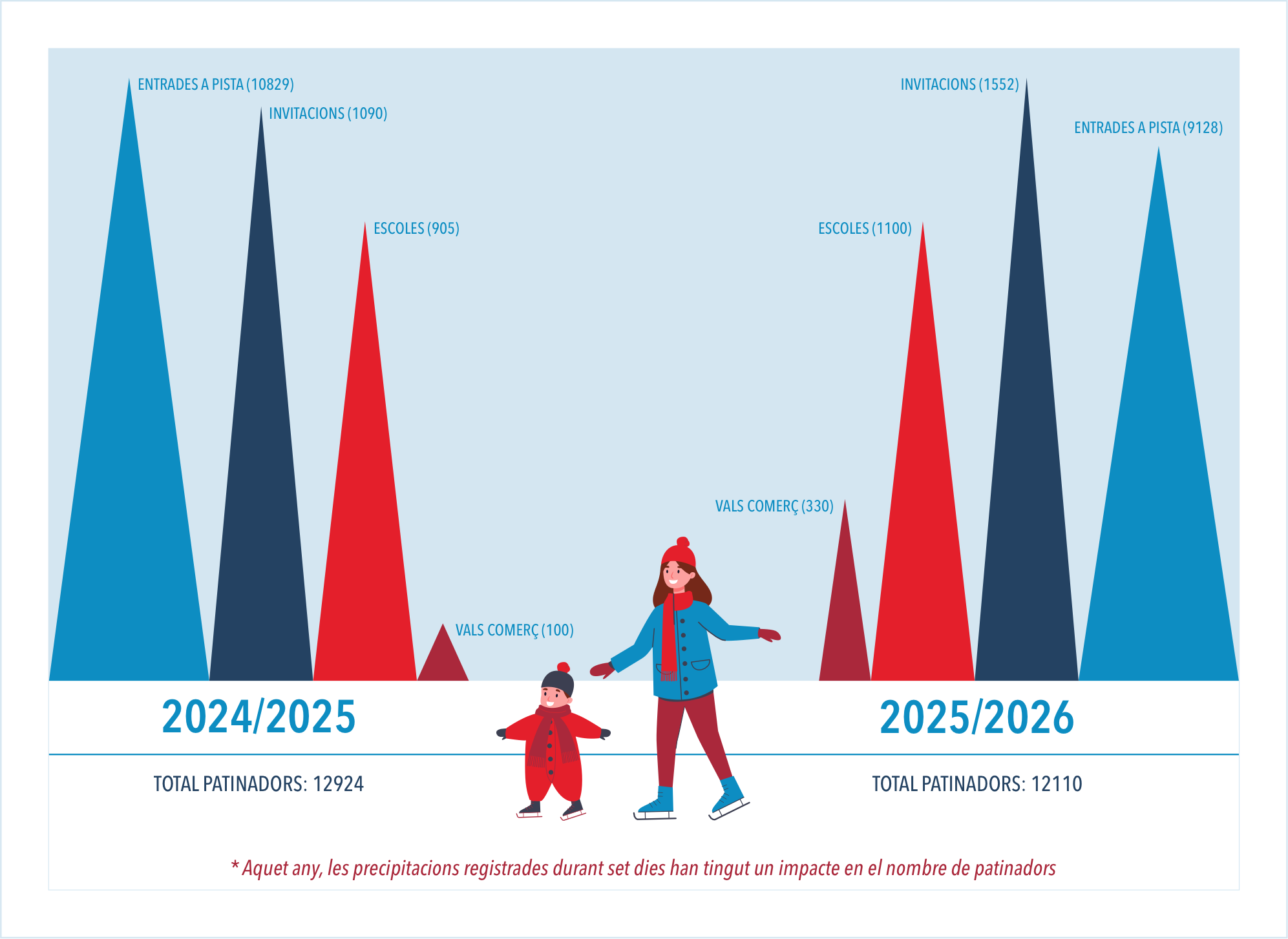 La temporada 2025/2026 ha mantingut un nivell molt elevat d’activitat, amb un total de 12.110 patinadors. Cal tenir en compte que, tal com indiquen les dades, les precipitacions registrades durant set dies van tenir un impacte directe en l’assistència, fet que dona encara més valor a les xifres assolides. En aquest període, les entrades a pista van créixer de manera notable fins a les 9.128, mentre que les invitacions es van situar en 1.552. La participació d’escoles, amb 1.100 alumnes, també va augmentar, consolidant la pista com una activitat de referència per als centres educatius. Els vals comerç van registrar 330 usos, evidenciant una major connexió entre l’oci nadalenc i el consum de proximitat.