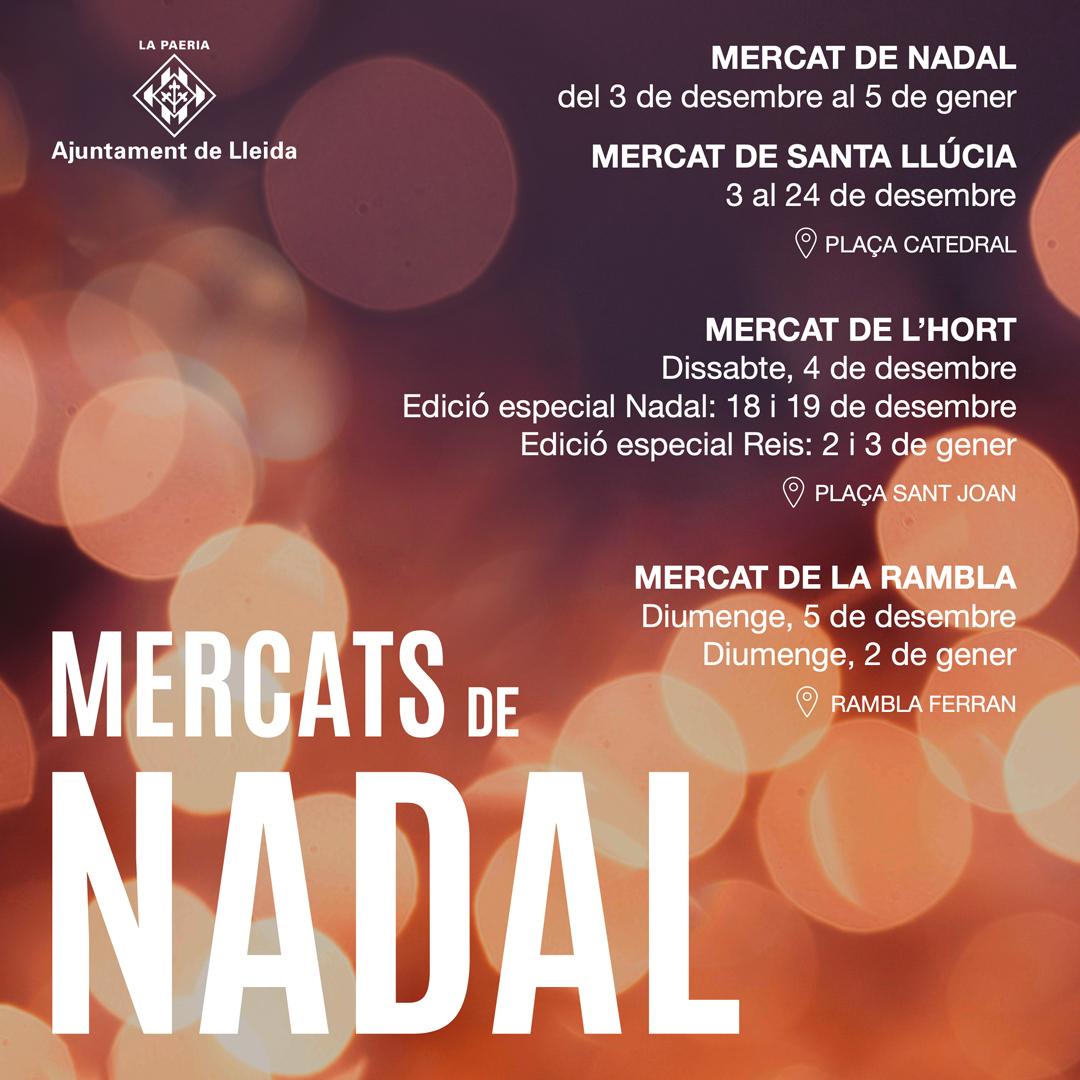 La regidoria de Consum, Comerç, Mercats i Participació ultima els detalls perquè aquesta setmana, a partir de divendres 3 de desembre, comencin a realitzar-se les diferents edicions dels mercats i mercadets previs a Nadal a la ciutat de Lleida.
