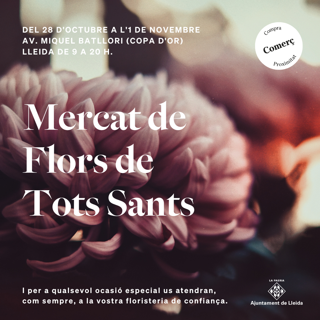L’Ajuntament de Lleida, a través de la Regidoria de Consum, Comerç, Mercats i Participació, impulsa el Mercat de Flors de Tots Sants, que es podrà visitar des d’aquest divendres, 28 d’octubre, i fins al mateix dia 1 de novembre.