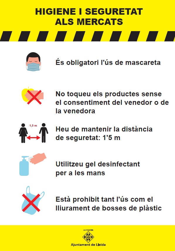 Els i les paradistes tenen a la seva disposició uns cartells emesos per la Paeria on es recorden les mesures essencials a seguir, com l’ús obligatori de la mascareta, mantenir les distàncies de seguretat, l’ús de gel desinfectant o no tocar els productes sense l’autorització dels venedors/es.