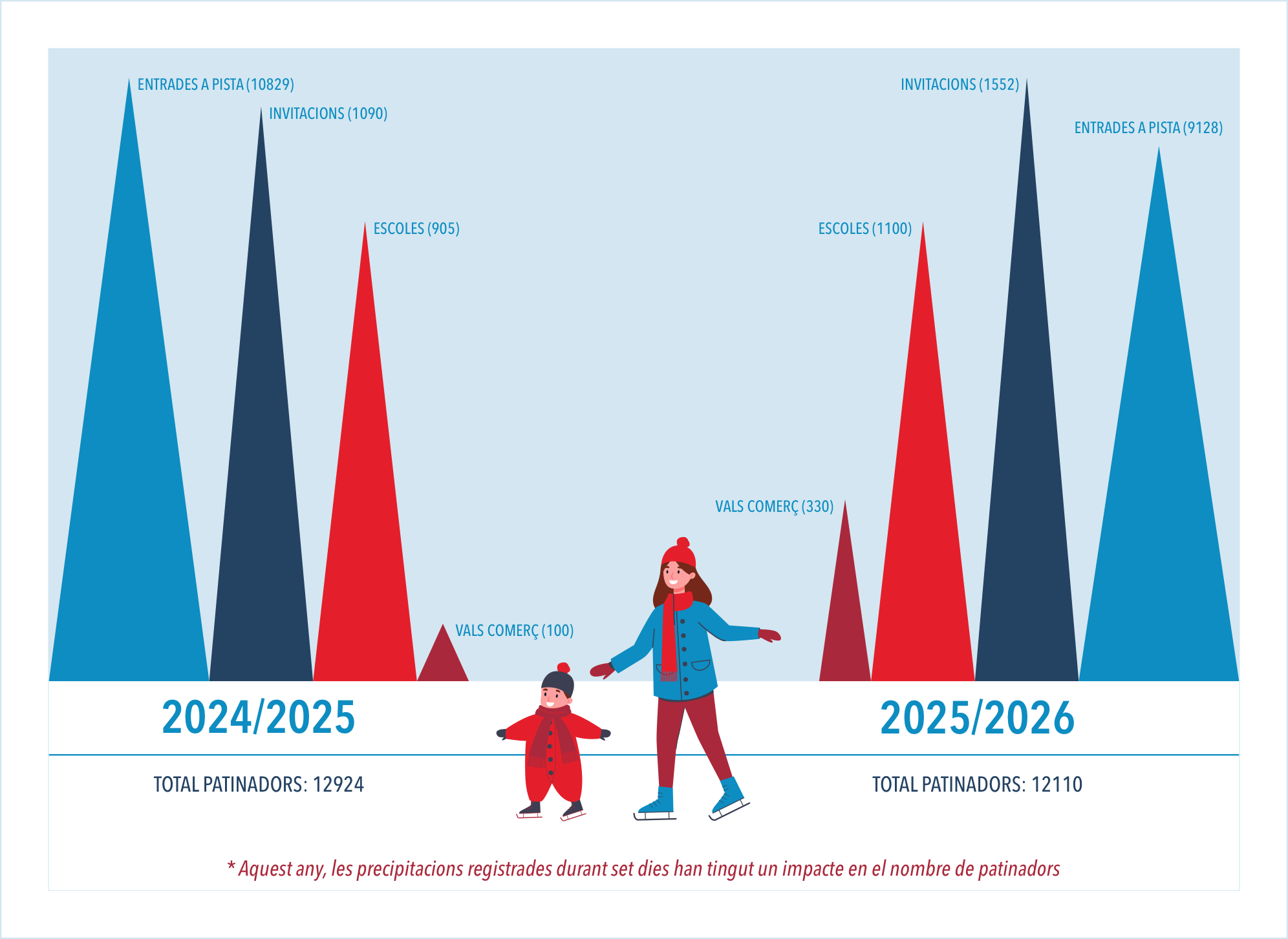 La temporada 2025/2026 ha mantingut un nivell molt elevat d’activitat, amb un total de 12.110 patinadors. Cal tenir en compte que, tal com indiquen les dades, les precipitacions registrades durant set dies van tenir un impacte directe en l’assistència, fet que dona encara més valor a les xifres assolides. En aquest període, les entrades a pista van créixer de manera notable fins a les 9.128, mentre que les invitacions es van situar en 1.552. La participació de les escoles, amb 1.100 alumnes, també va augmentar, consolidant la pista com una activitat de referència per als centres educatius. Els vals de comerç van registrar 330 usos, evidenciant una connexió més granentre l’oci nadalenc i el consum de proximitat.