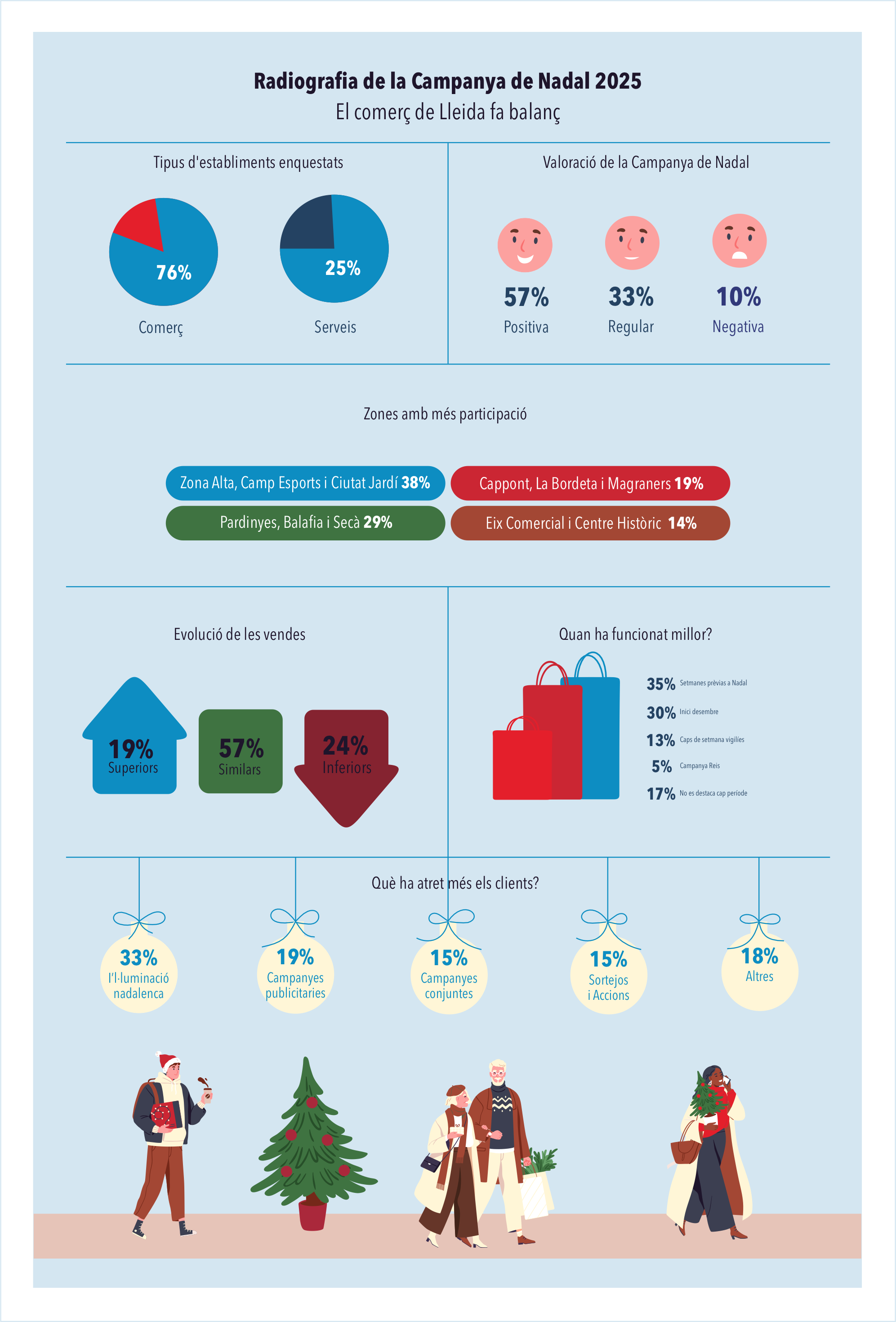 La campanya de Nadal continua sent un dels períodes més importants per al comerç local i els serveis de la ciutat. Més enllà de l’impacte econòmic, aquest moment clau de l’any també esdevé una oportunitat per escoltar de primera mà com s’ha viscut el Nadal als carrers i als barris de Lleida. En aquest sentit, l’enquesta realitzada ofereix una fotografia de la realitat nadalenca a la ciutat. Les respostes recollides permeten identificar tant els principals punts forts de la campanya com aquells aspectes susceptibles de millora, aportant una visió útil per afrontar futures edicions. L’objectiu de la iniciativa és compartir informació, entendre la diversitat de realitats existents i continuar treballant conjuntament per avançar cap a una campanya de Nadal més equilibrada, propera i adaptada a les necessitats de cada zona.