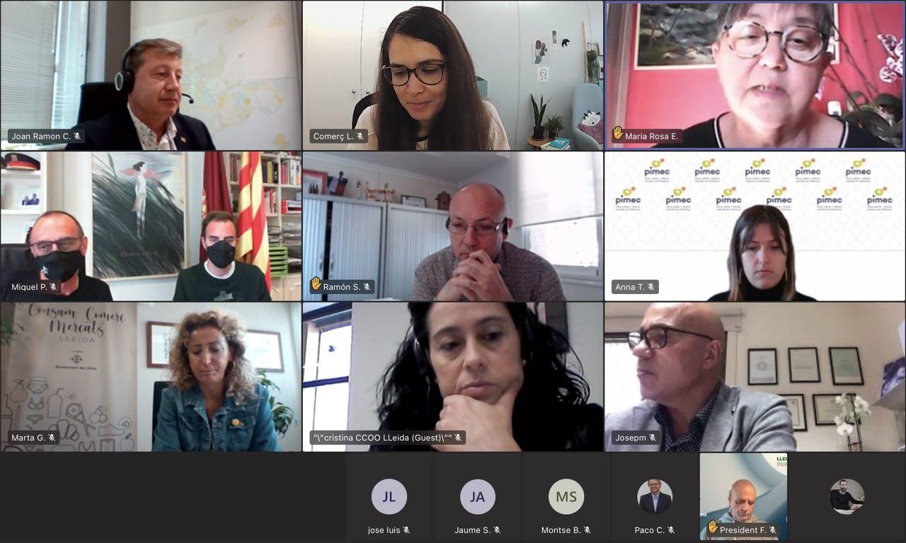 El tinent d'alcalde Paco Cerdà i els regidors Joan Ramon Castro, Marta Gispert i Ignasi Amor han participat en la reunió telemàtica d’avui amb els representants dels sindicats de CCOO i UGT, Pimec, la Fecom, la Federació d’Hostaleria, la Cambra de Comerç, la Coell i la FAVLL. Entre altres qüestions, s’ha fet seguiment de la situació de la Covid-19 a Lleida i s‘ha parlat del progrés de les dades, amb dades més esperançadores, a les quals ha contribuït la vacunació.