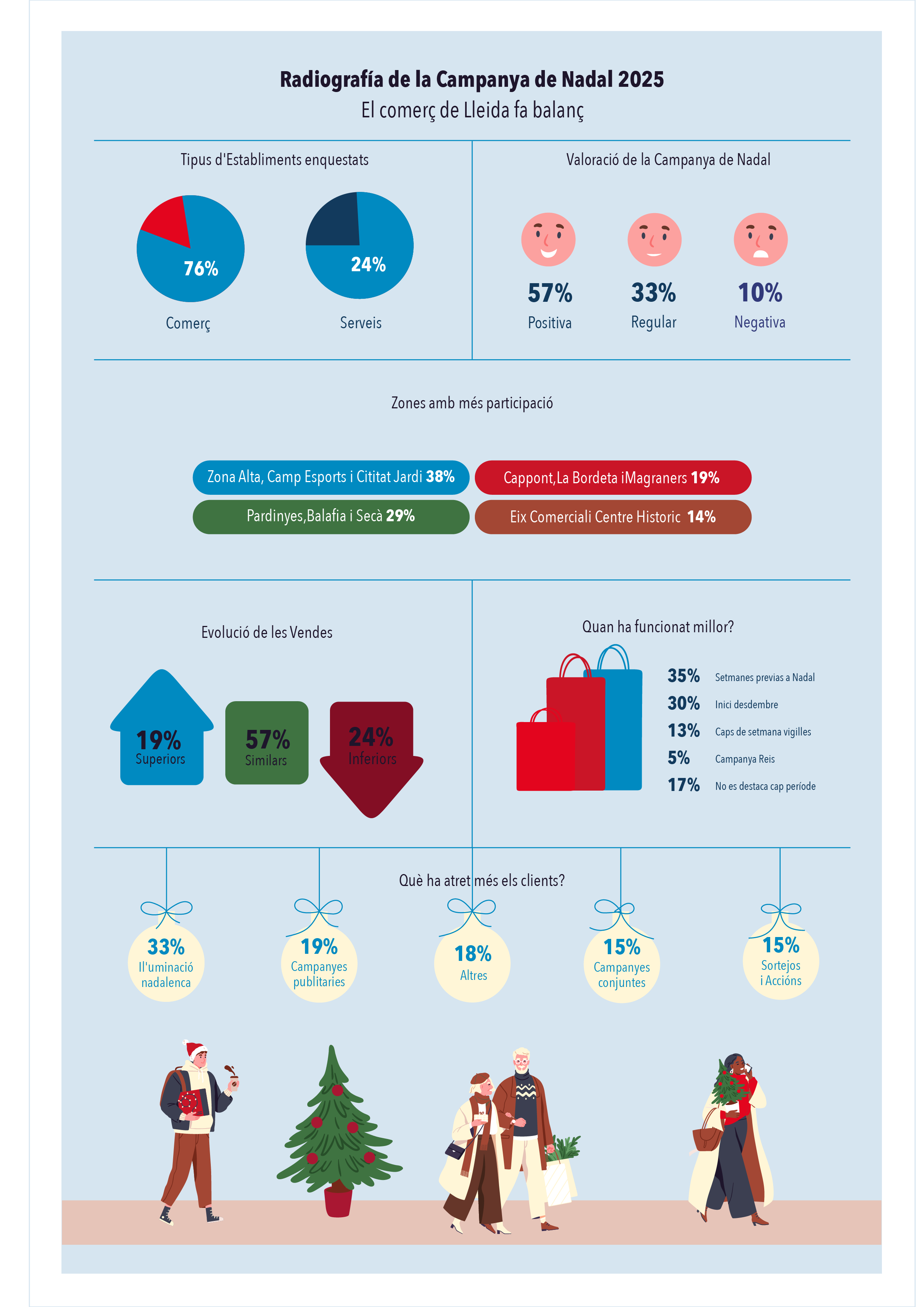 La campanya de Nadal continua sent un dels períodes més importants per al comerç local i els serveis de la ciutat. Més enllà de l’impacte econòmic, aquest moment clau de l’any també esdevé una oportunitat per escoltar de primera mà com s’ha viscut el Nadal als carrers i als barris de Lleida. En aquest sentit, l’enquesta realitzada ofereix una fotografia de la realitat del Nadal a la ciutat. Les respostes recollides permeten identificar tant els principals punts forts de la campanya com aquells aspectes susceptibles de millora, aportant una visió útil per afrontar futures edicions. L’objectiu de la iniciativa és compartir informació, entendre la diversitat de realitats existents i continuar treballant conjuntament per avançar cap a una campanya de Nadal més equilibrada, propera i adaptada a les necessitats de cada zona.